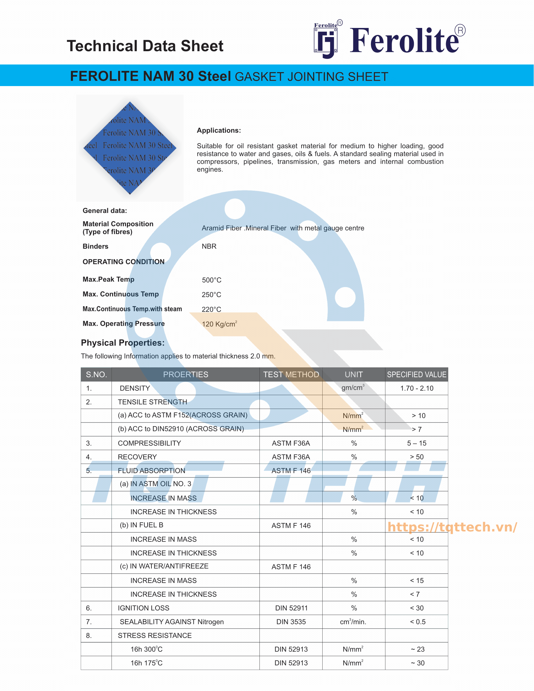 Gioăng Không Amiang Nam 30 Steel được cấu tạo từ sợi aramid, chất sơ khoáng và chất kết dính cao su NBR. Qua quá trình cán nóng tạo ra sản phẩm tấm đệm.