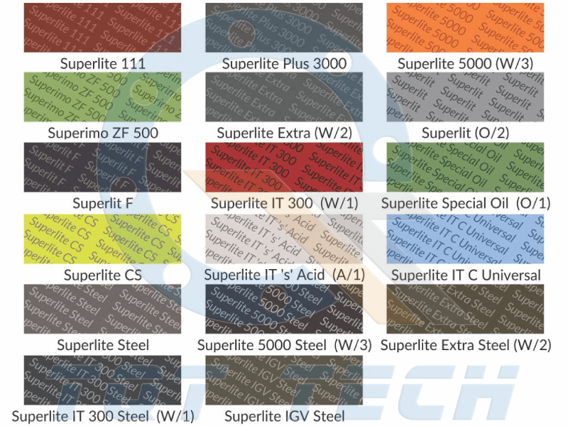 Tấm amiang Superlite được sản xuất từ vật liệu sợi amiang, có kết hợp với sợi thép hoặc không theo từng ứng dụng, và được liên kết với các loại cao su tổng hơp như NBR, EPDM, FKM,...Thông qua quá trình cán nóng tạo thành sản phẩm. Vì thế sản phẩm tấm amiang Superlite rất đa dạng về chũng loại, thông số kỹ thuật cũng như là mẫu mã.